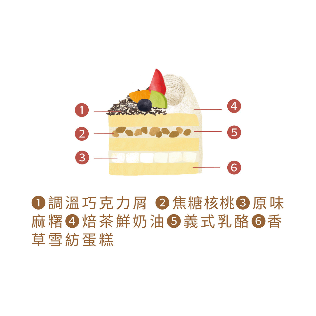 ✦ 焦糖核桃 ✕ 原味麻糬 ✕ 焙茶鮮奶油 ✕ 義式乳酪 ✕ 香草雪紡蛋糕 ✦